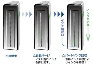 I was equipped with (removal of air from the nozzle) can be purged with one switch “Auto purge system”. (The. Can not be used in down printing) ink discharged in the purge is automatically collected, there is no need to wipe. Is not only purge switch of the head, purge is also an external signal.